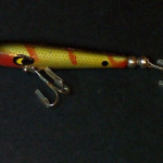 A-1000 Warhorse - The lure is stamped DEVELS Warhorse. The two peice box is marked A-1004 DEVELS Warhorse. Color: # 4 Green Minnow. 1956 - 1963