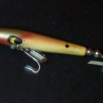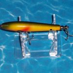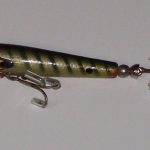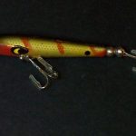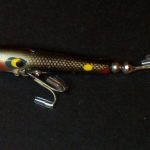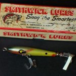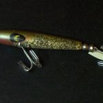 A-1000 Warhorse - The lure is stamped DEVELS Warhorse. The two peice box is marked A-1004 DEVELS Warhorse. Color: # 4 Green Minnow. 1956 - 1963