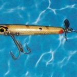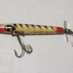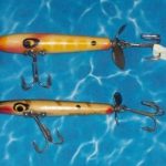The top lure is the regular S-700 Dancer Sinker. It has a fat body, heavy hooks and pointed spinners. It shows up in the charts for 1953 and 1958. Bottom Lure: In 1960 keeps the same number, S-700 but the lure changes. It is now skinny, smaller hooks and bow tie spinner's. It only lasts one year. By 1961 they no longer offer a Sinking Dancer.