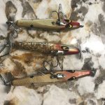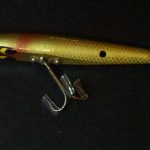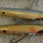 B-900 Ma Scooter - DEVELS - The bottom lure is the Ma Scooter. You don't see many of them with the heavy hook hanger. Color: Shad. 1955 (Top lure is a Prancer, Middle lure is a Dancer, also rare with heavy hook hanger - all from 1955)