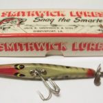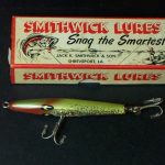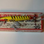 B-900 Ma Scooter - The lure is stamped: Devels Horse Ma Scooter. It is in the color: Shad. The 1 1/4" box is stamped: B-908 Devels Horse Ma Scooter. 1956-1963