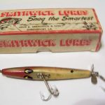 B-900 Ma Scooter - This lure has the two peice cardboard box. The box is marked B-906 DEVELS HORSE MA Scooter. Color: #6 Silver Flash with red rib. The Ma Scooter has a 3 3/4" wood body which is flat on the bottom. It has one small rounded spinner on the rear. It has two hooks. 1956-1963