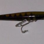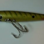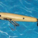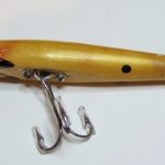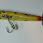 B-900 Ma Scooter - This lure is stamped Devels Horse Ma Scooter. It comes in color # 9 Perch. The Ma Scooter has a 3 3/4" wood body which is flat on the bottom. It has one small rounded spinner on the rear. It has two hooks. 1956-1963