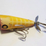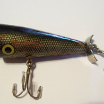 This is a Gandy Dancer Jr. The wood body is 2 3/4" long. It has the old heaver hardware. It has no spinner on the rear and it has two hooks. It is not stamped with a name. It is a different color. It seems to be a blend of Black Shiner and Golden Shiner. Perhaps it is the color that turned into color #3 Golden Shiner. 1949-1952