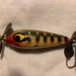 S-300 Jack Sprat - You can't read the name on the lure as it is scuffed on the back. I think the color: #8 Shad. It the heavier hook hanger and also has the split ring on the line tie. The wood body is 1 3/4" long. It has two small spinners and large hooks to give it additional weight so it will sink. 1951-1955