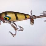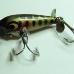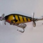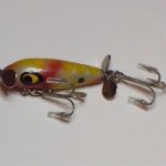 S-300 Jack Sprat - This lure is not marked. It is in color #5 Yellow & Black Stripper. The wood body is 1 3/4" long. It has two large hooks to give it additional weight so it will sink. 1956-1958