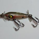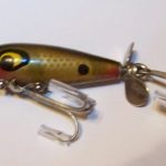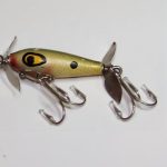 S-300 Jack Sprat - This is an old Jack Sprat. The bait is stamped Jack Sprat. Not sure what color it is.. It has the heavy hook hanger . The wood body is 1 3/4" long. It has two large hooks to give it additional weight so it will sink. This is the only Jack Sprat I have seen that has the two large floppy spinners instead of the smaller spinners. 1951-1955