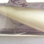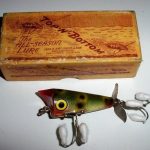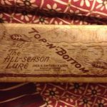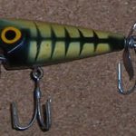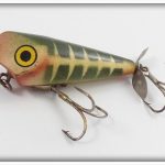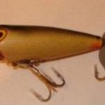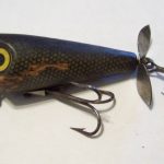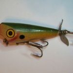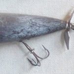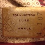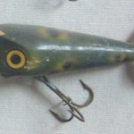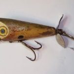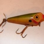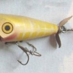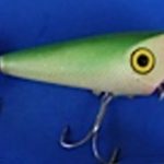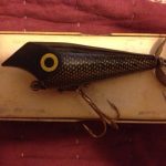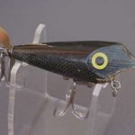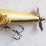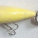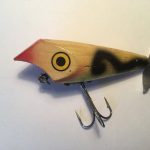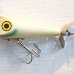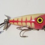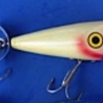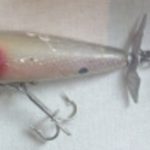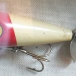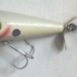 This is an early Smithwick lure. White with Red Ribs. Produced from about 1949 to 1952. It is stamped "Stud Duck". It has the heavy hook hanger and the split ring on the line tie.