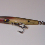 B-1000 Warhorse - This is an interesting lure. It came out of Louisiana. It is stamped ... Devels Warhorse. The Warhorse usually comes with a ball weight on the rear. This one has the Smithwick large spinner on the rear. It also had a Barracuda spinner on the front with a red bead. I cleaned the lure and removed the barracuda spinner and red bead as they were in my opinion added after leaving the factory. Perhaps the rear spinner was also added and the ball weight removed. It is in the color #3 Golden Shiner. 1956-1963