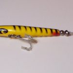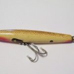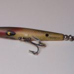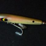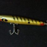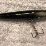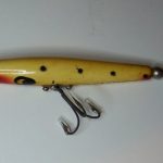 B-1000 Warhorse - Lure is stamped Devels Warhorse. This lure is in an uncatalogued color. Yellow with Black Spots. 1956-1963