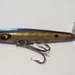 B-1000 Warhorse - The lure is stamped DEVELS Warhorse. But, the lure does not have the ball weight. Instead it is set up like a L-100. It has only two hooks and has two spinners. Color: #14 Green Stripper. 1956-1963