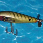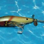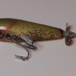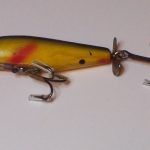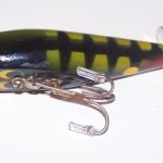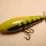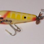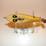 Buck & Bawl - Color: #15 Yellow with Green Back. This color shows on the charts from about 1958 to about 1960 when it was changed to Yellow with Green Spots. This one has the eyes fully on the flat bottom of the lures. From observation it would appear that the post 1965 lures have the eyes half on the bottom and half on the sides.