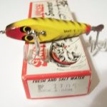 Buck & Bawl - Color: #7 Yellow & White. This color shows up on the first charts about 1958 and and is changed in about 1960 to Butterfly Yellow. It lost it's distinctive Red Rib by about 1963. This one has the eyes fully on the flat bottom of the lures. From observation it would appear that the post 1965 lures have the eyes half on the bottom and half on the sides.