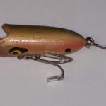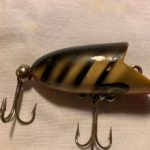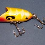 DEVELS Stud - Have not seen this this lure in a color chart. This one is the smaller size. The wood body in 2" long. Color: #7 Yellow & White (Butterfly Yellow). 1956 - 1962