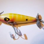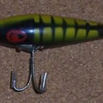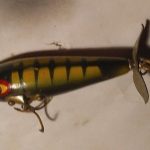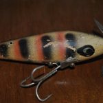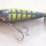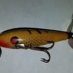 Another great lure. Snipe with heavy hook hanger, Red see through eye and in the color, Yellow with Black Ribs. Produced 1949-1955. I am guessing this is from 1949-1950