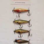 The first two lures were probable from the very first year’s production run. The first one is in the old color – White with Red Ribs and a Mustard Eye. The only other one I have ever seen in this color is in Jack Smithwick’s personal tackle box at Bacon’s Tackle in Shreveport, LA. The second King Snipe is in the color Silver Flash with the mustard eye. I have only seen one other King Snipe with a mustard eye, other than the White/Red color, and that is the one in the color Shad that is hanging on the wall in the Smithwick collection at The Bass Pro Shop in Bossier City, LA. I don’t think the mustard eye was used beyond 1950-1951.