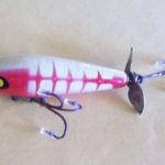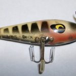This is an old Top-N-Bottom era King Snipe. It comes with the mustard yellow eyes and the White body with Red Ribs. This one was probable from the very first year’s production run. The Snipes started production about 1949. This color is from the color chart just prior to this. The only other one I have ever seen in this color is in Jack Smithwick’s personal tackle box at Bacon’s Tackle in Shreveport, LA. I don’t think the mustard eye was used beyond 1950-1951.