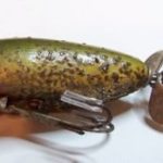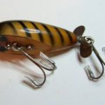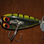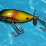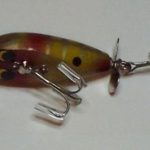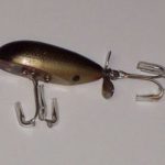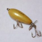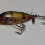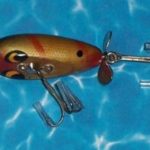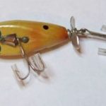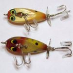 Scooters - Old and New - The top lure is the oldest Scooter. A different blank. Small circle eyes and the heavy hook hanger. 1953 - 1955. The bottom lure is the newer Scooter - Light hook hanger. 1956 - 1959. It is in the color Yellow with Silver Ribs.